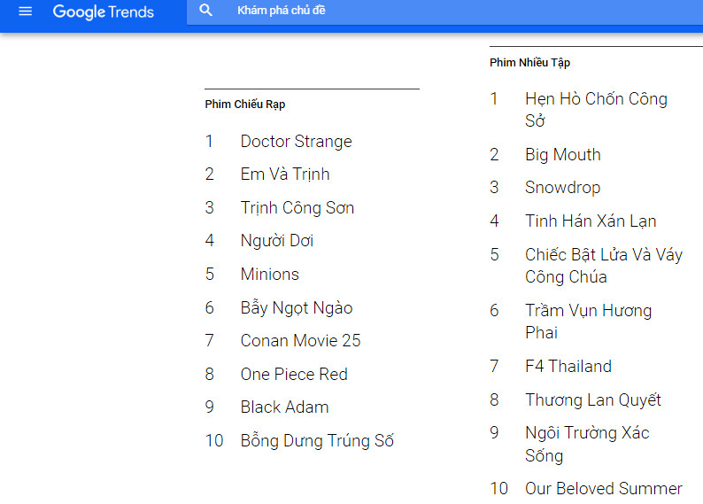 Nhìn vào nội dung tìm kiếm thịnh hành trong năm 2022 trên Google Việt Nam ở hạng mục Phim nhiều tập có thể thấy rất rõ điều này. Top 10 hoàn toàn bị thống trị bởi những bộ phim nước ngoài mà ở đây là Hàn Quốc và Trung Quốc là chủ yếu.