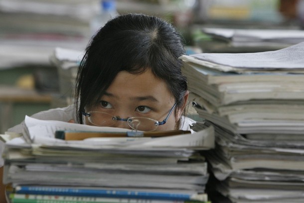 | Học sinh Trung Quốc ngập trong núi bài vở để chuẩn bị thi đại học. Ảnh: China daily. |