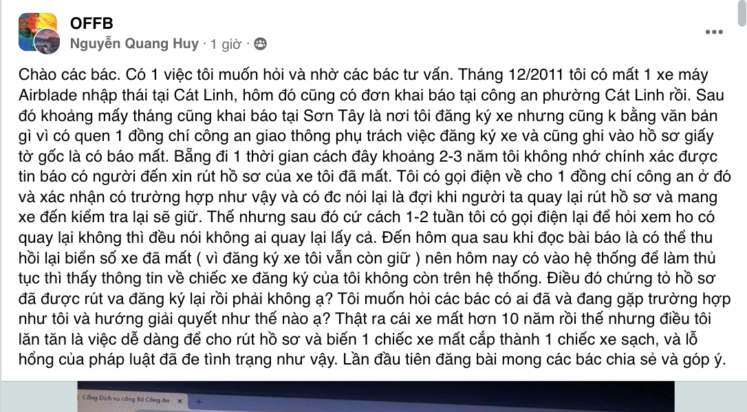 “Tôi muốn hỏi các bác có ai đã và đang gặp trường hợp như tôi và hướng giải quyết như thế nào ạ? Thật ra cái xe mất hơn 10 năm rồi, nhưng điều tôi lăn tăn là có việc dễ dàng cho rút hồ sơ và biến 1 chiếc xe mất cắp thành 1 chiếc xe sạch hay không?”, tài khoản Nguyen Quang Huy viết.