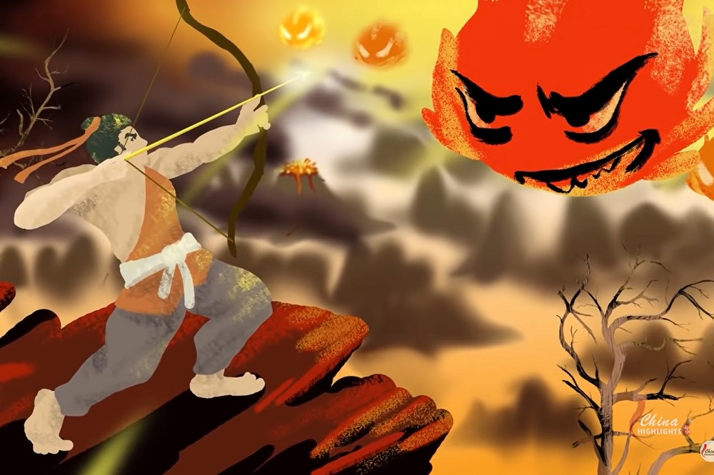Truyền thuyết Trung Quốc kể rằng, Trái Đất khi xưa đã phải chịu sự thiêu đốt của mười mặt trời, vốn là những người con trai của Ngọc Hoàng. Người dân, các loài động vật và cỏ cây khi đó đều hứng chịu sức nóng từ nhiều mặt trời mà không thể phản kháng lại.