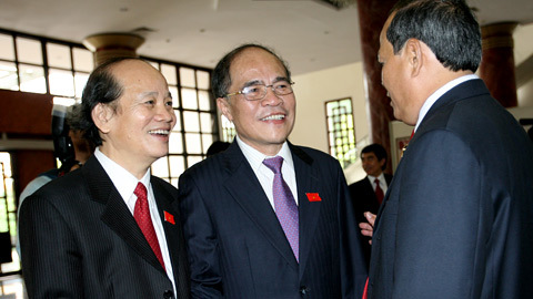 | Chủ tịch QH Nguyễn Sinh Hùng, Chủ tịch Ủy ban dự thảo sửa đổi Hiến pháp 1992 trò chuyện với đại biểu QH tại kỳ họp vừa qua. Ảnh: Lê Anh Dũng |