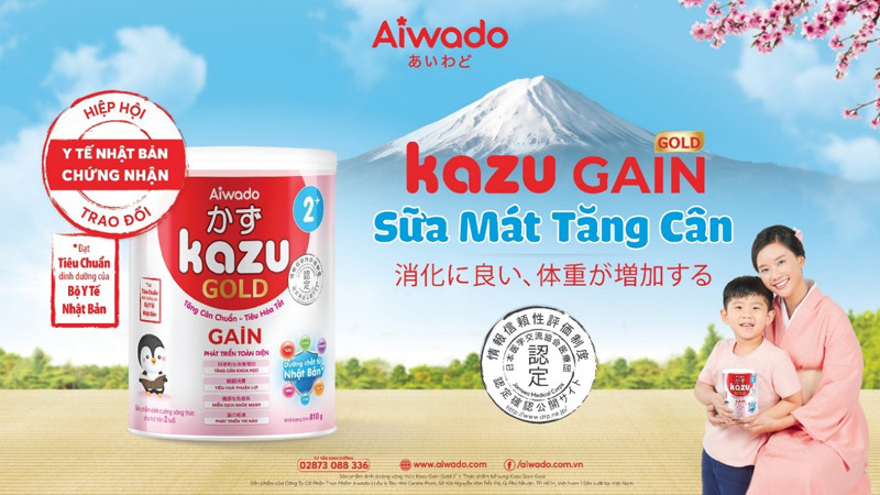 Thương hiệu Dinh dưỡng chuẩn Nhật Bản - Aiwado cam kết mang đến nguồn dinh dưỡng toàn diện cho sự phát triển trọn vẹn cả vòng đời bằng việc tuân thủ chuẩn mực khoa học, tôn trọng tự nhiên và tận tâm với con người. Luôn nỗ lực vì thế hệ trẻ em Việt Nam phát triển toàn diện về thể lực, trí lực và tâm hồn, Aiwado tự hào mang trọn tinh tuý dưỡng chất từ Nhật Bản tạo ra sản phẩm cao cấp Kazu Gain Gold - theo tiêu chuẩn dinh dưỡng của Bộ Y tế Nhật Bản và được Hiệp hội trao đổi Y Tế Nhật Bản chứng nhận. Sản phẩm dinh dưỡng công thức sữa mát tăng cân Kazu Gain Gold nhờ Lợi khuẩn Nhật Bản và Bộ 3 siêu chất xơ (GOS Nhật Bản, HMO, FOS) cùng Hệ Đạm Quý (Đạm Whey, Đạm Sữa) & MCT Cao cấp giúp trẻ tăng cân khoẻ mạnh. Đặc biệt với Canxi Nhật Bản, Taurine Nhật Bản, DHA từ Tảo Nhật Bản tự nhiên giúp trẻ phát triển chiều cao tối ưu, thông minh, sáng mắt cùng nhiều dưỡng chất quý khác để trẻ phát triển toàn diện. Công ty Cổ phần Thực phẩm Aiwado Lầu 9, Toà nhà Center Point – 106 Nguyễn Văn Trỗi, Phường 8, Quận Phú Nhuận, TP.HCM Tư vấn dinh dưỡng: 02873 088 336 Website: https://aiwado.com Fanpage: https://facebook.com/aiwado.com.vn |