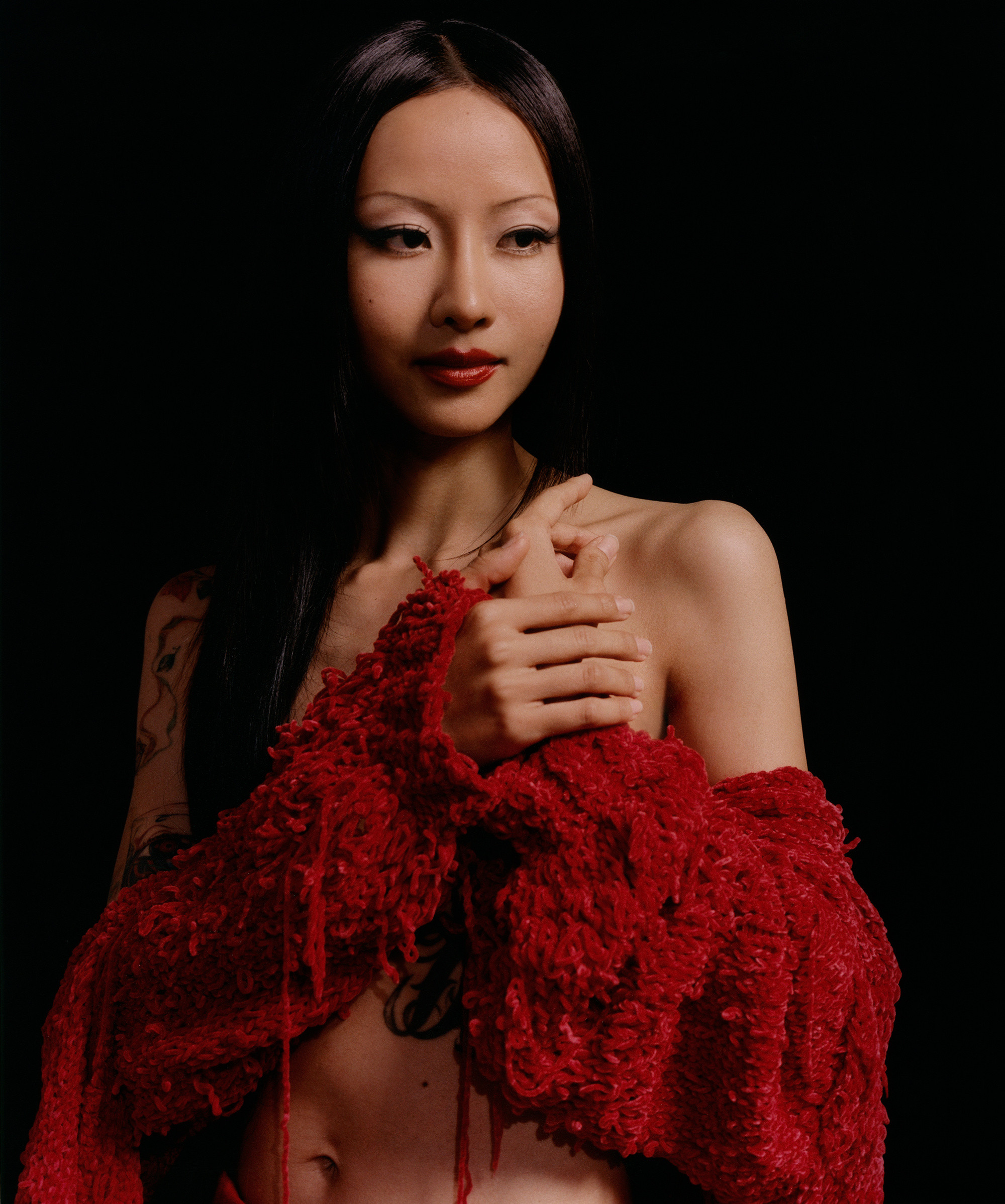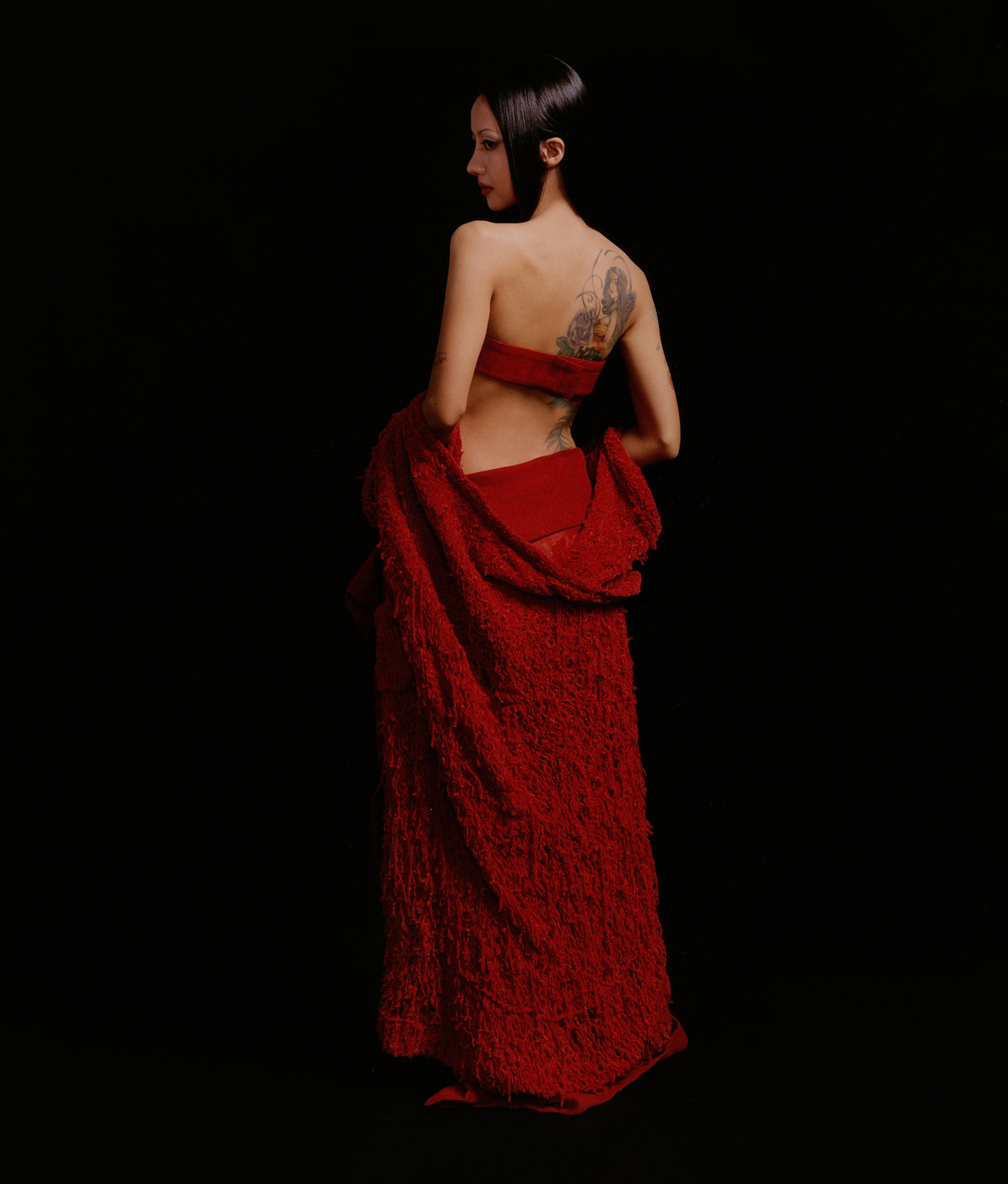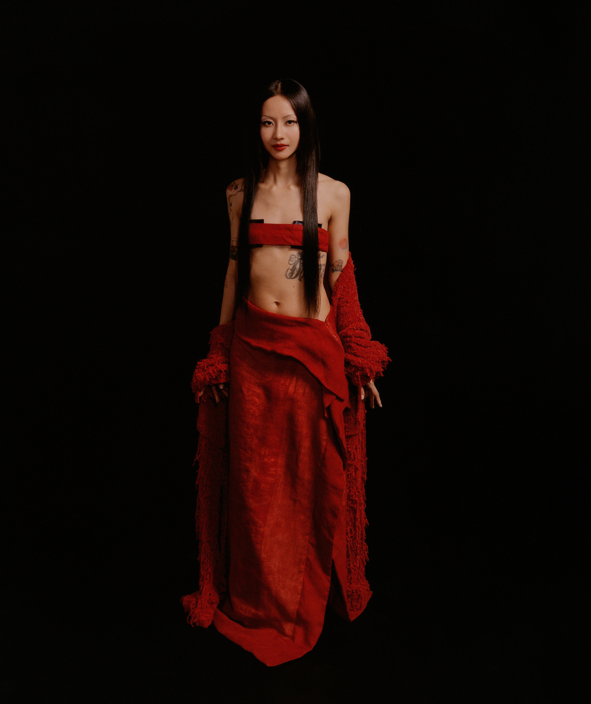 Nhà thiết kế thể hiện sở trường với các gam màu đỏ, đen, trắng cùng kỹ thuật đắp vải, dập ly và sắc thái dark-wear.