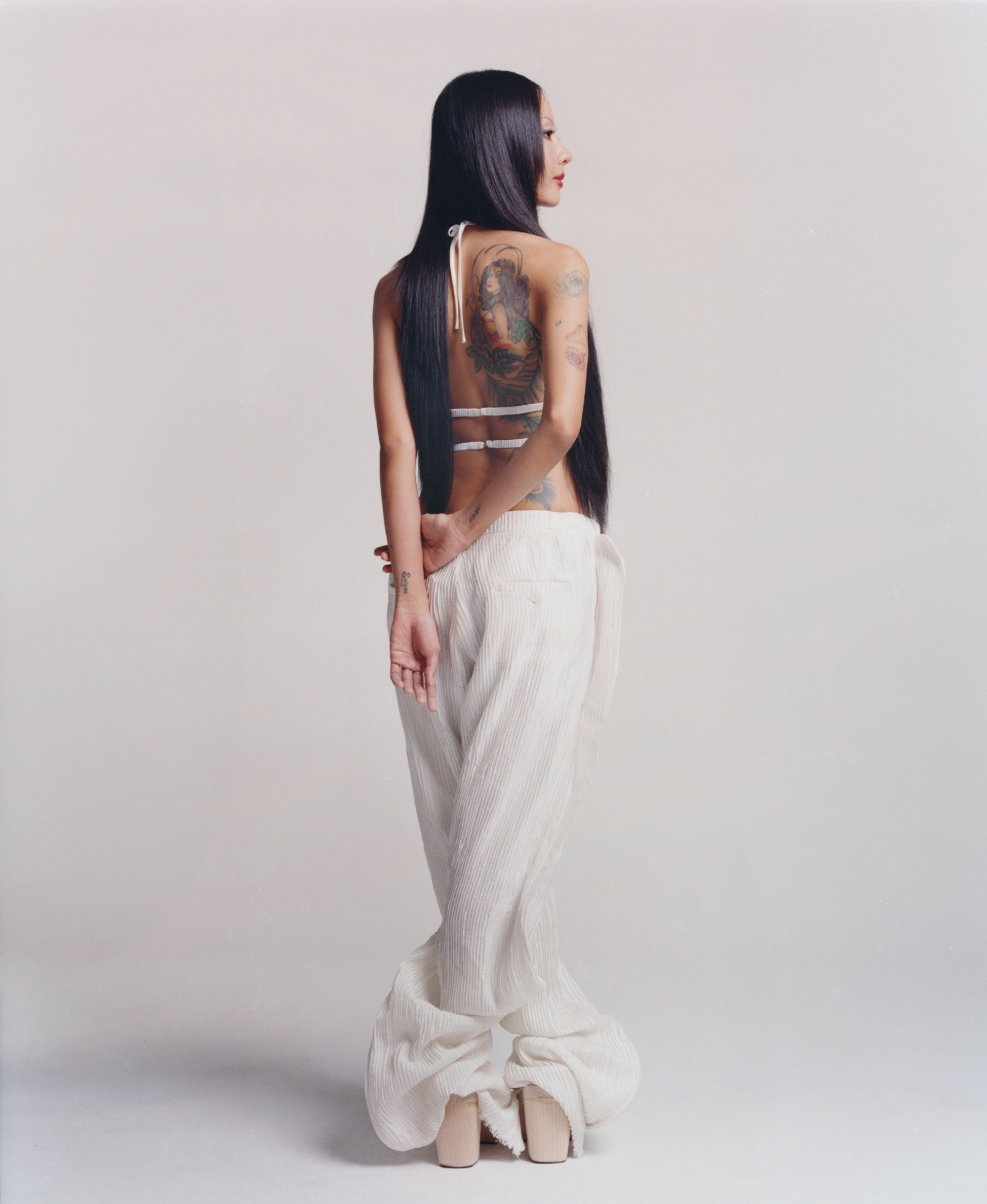 Riêng bộ sưu tập này, anh còn làm mới bằng áp dụng những phom dáng vuông và chữ nhật mềm mại giúp tôn cơ thể người mặc. Áo 2 tà, áo yếm, khăn mỏ quạ, guốc mộc... được thể hiện dưới góc nhìn thời trang đương đại của nhà thiết kế.Khi thực hiện bộ sưu tập mới, Nguyễn Hoàng Tú nghĩ đến rapper Suboi đầu tiên. Cô khác lạ vừa gai góc vừa mềm mại.Suboi nói: "Hình ảnh phụ nữ Việt Nam luôn thường trực trong tâm trí tôi. Bản thân không thể ngừng suy nghĩ về những đặc ân lẫn gánh nặng vô hình áp trên vai họ, từ tài hoa, tảo tần, thao lược, quyết đoán đến mang thai, làm hậu phương, chịu đựng, đợi trông”.Suboi thích thiết kế của Nguyễn Hoàng Tú vì sự 'duyên dáng trong tinh giản'. Cụ thể, trang phục không cầu kỳ nhưng dễ thấy cách chọn chất liệu, cắt may rất tỉ mỉ."Tôi không thấy phải gồng mình lên để mặc những trang phục này, trái lại là chúng phục vụ sự hiện diện của mình. Tôi yêu thích phong cách thời trang của Tú như 8 năm nay vẫn vậy", Suboi cho hay.