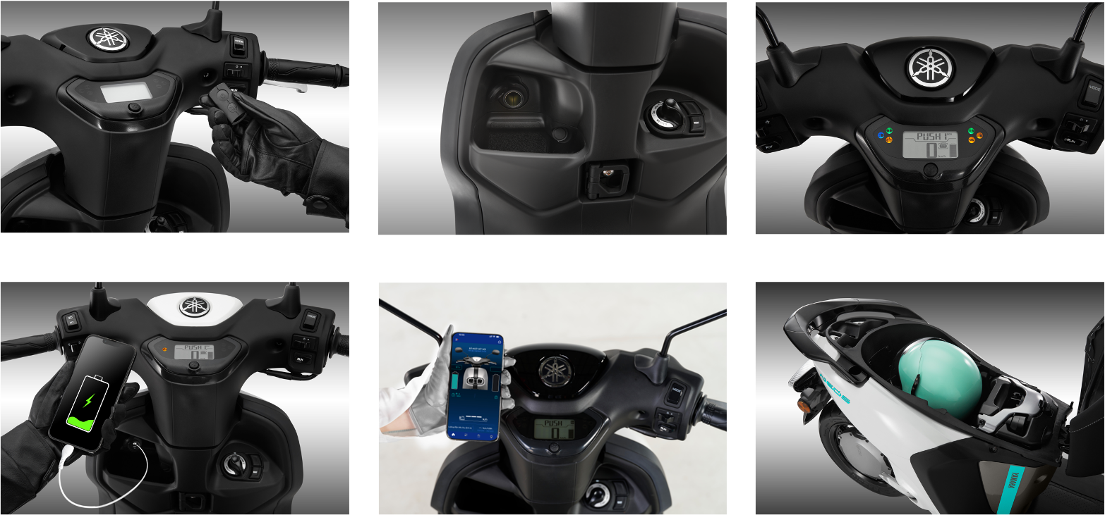 Mẫu xe máy điện của Yamaha còn được trang bị hàng loạt tiện ích hiện đại, phù hợp với giới trẻ như: hệ thống khóa thông minh, cổng sạc điện thoại, hộc để đồ, cụm đồng hồ LCD nhỏ gọn (hiển thị tuổi thọ pin, trạng thái pin, cuộc gọi), pin có thể tháo rời để sạc trong nhà hoặc sạc trực tiếp tại xe, cốp xe siêu rộng, ứng dụng kết nối với xe qua điện thoại Y-Connect (có thể hiển thị báo tin nhắn, cuộc gọi trên bảng đồng hồ xe, cập nhật tình trạng xe, nhắc nhở lịch bảo trì…).