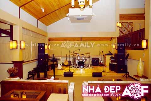 Phòng giải trí của đại gia đình hoành tráng, hiện đại với các loại nhạc cụ từ piano, dàn trống đến cả ghita.