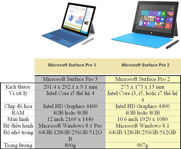 Trong khi Surface Pro 2 dùng vi xử lý Intel Core i5-4200U CPU, Surface Pro 3 có cả phiên bản dùng vi xử lý Core i7. Màn hình 12 inch độ phân giải 2160 x 1440 pixel của máy có cỡ lớn hơn và sắc nét hơn màn hình 10.6 inch 1080p của Surface Pro 2. Camera 5MP 1080p mặt trước của Surface Pro 3 cũng cho chất lượng ảnh chụp tốt hơn camera 720p của thế hệ trước.