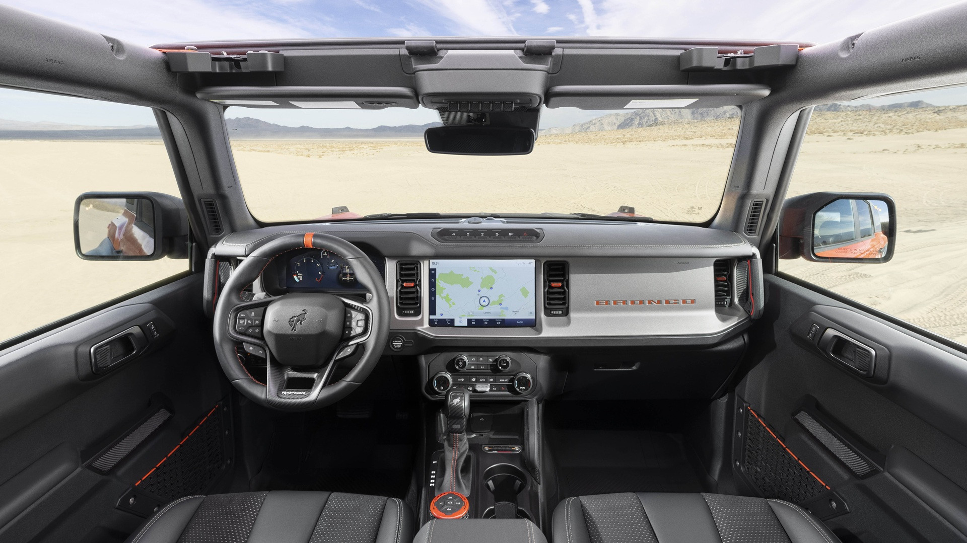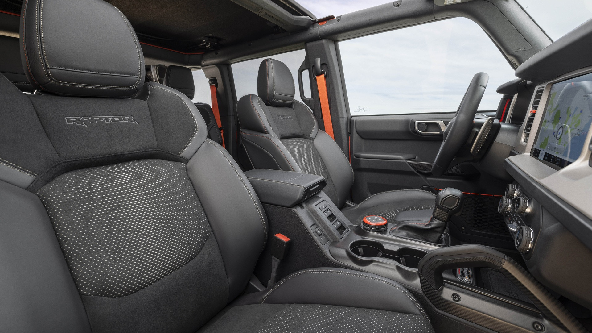 Nội thất của Ford Bronco Raptor vẫn chưa được tiết lộ chi tiết về màu sắc chủ đạo, tuy nhiên, xe sẽ có nhiều yếu tố thiết kế đặc trưng của phiên bản Raptor. Phía sau vô-lăng là màn hình đa thông tin 12 inch với giao diện đặc trưng của dòng Raptor, trong khi ghế ngồi được trang bị loại Ford Performance mang đến sự thoải mái và hỗ trợ tối ưu. Màn hình giải trí trung tâm cũng có kích thước 12 inch, giúp người dùng dễ dàng tương tác với các tính năng. Một số tiện nghi nổi bật khác của xe bao gồm hệ thống âm thanh 10 loa Bang & Olufsen, sạc không dây, điều hòa tự động 2 vùng và đèn nội thất LED, mang đến trải nghiệm sang trọng và tiện nghi cho người sử dụng.