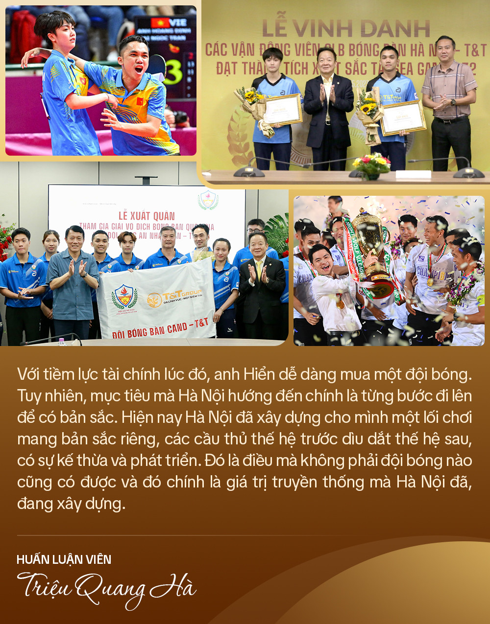 Đáng chú ý, gắn liền với thương hiệu T&T và danh xưng “bầu” Hiển là CLB Bóng đá Hà Nội T&T - tiền thân của CLB Bóng đá Hà Nội (Hanoi FC) ngày nay. Trước khi xác lập nhiều kỷ lục ấn tượng như 6 lần vô địch V-League, 3 lần vô địch liên tiếp Cúp Quốc gia và 5 lần vô địch Siêu cúp bóng đá Việt Nam, Hanoi FC là “lính mới” bắt đầu từ giải hạng ba. Dưới sự dẫn dắt của HLV Triệu Quang Hà, Hà Nội T&T trong 3 năm liên tiếp đã thăng liền 3 hạng, chính thức bước chân vào đấu trường V-League danh giá năm 2009. Kỷ lục đó đến giờ vẫn chưa có đội bóng nào phá vỡ.