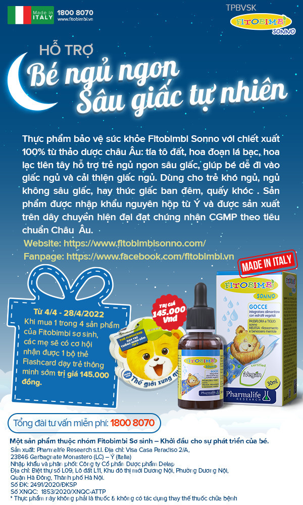 TPBVSK Fitobimbi Sonno hỗ trợ bé ngủ ngon sâu giấc, nhập khẩu nguyên hộp từ Italy, được bán tại các nhà thuốc, các cửa hàng mẹ và bé trên toàn quốc. ![]() Từ 4/4 - 28/4/2022, Fitobimbi triển khai chương trình khuyến mãi, khi mua 1 sản phẩm Fitobimbi Sơ sinh bất kì (Fitobimbi Sonno, Fitobimbi Omega Junior, Fitobimbi Gas và Fitobimbi D2K3) các mẹ sẽ nhận được 1 bộ thẻ Flashcard dạy trẻ thông minh sớm trị giá 145.000 đồng. Chương trình khuyến mãi có tổng giá trị lên tới trên 3,6 tỷ đồng. Quà tặng của chương trình này được đóng gói cùng sản phẩm khách hàng mua trong 1 hộp quà xinh xắn khi mua trên website, fanpage, các nhà thuốc và các cửa hàng mẹ và bé có đăng ký tham gia chương trình khuyến mại của nhãn hàng trên toàn quốc. Phần quà có số lượng giới hạn, truy cập website để biết thông tin chi tiết: https://fitobimbi.vn/tin-tuc/qua-tang-cho-be-niem-vui-cho-me-mua-1-tang-1/ Website: https://fitobimbi.vn/san-pham/sonno/ Facebook: https://www.facebook.com/fitobimbi.vn Tổng đài tư vấn: 1800 8070 Sản phẩm không phải là thuốc, không có tác dụng thay thế thuốc chữa bệnh. |