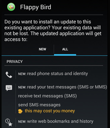 Trong khi bạn đang chơi game, mã độc kết nối với máy chủ điều khiển C&C để nhận lệnh rồi gửi tin nhắn đến số cho trước. Chúng ngụy trang trên mục thông báo bằng các tin nhắn văn bản đã nhận để người dùng không hay biết. Chúng còn đòi hỏi nhiều sự cho phép khác từ người dùng như cho phép đọc/gửi tin nhắn trong khi cài đặt, điều mà ứng dụng Flappy Bird gốc không có.