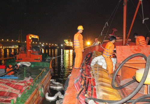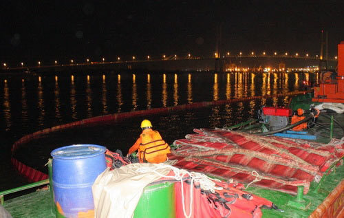 Một lượng dầu đã loang ra trên sông được doanh nghiệp tư nhân ứng cứu sự cố tràn dầu Đại Minh với 5 tàu khoanh vùng thu gom.
