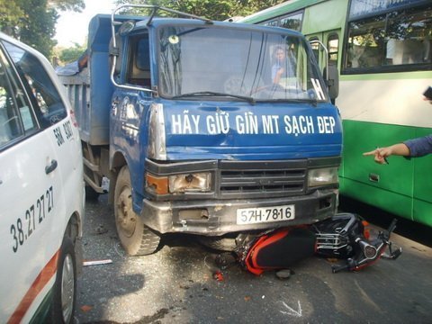 gầm xe tải, một xe gắn máy bị cán nát gần như hoàn toàn. Nhiều mảnh kính, bộ