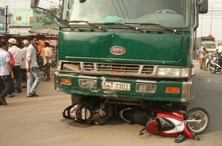 | Xe tải kẹp chặt hai xe gắn máy dưới đầu xe |