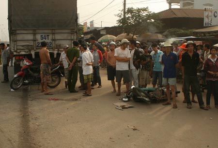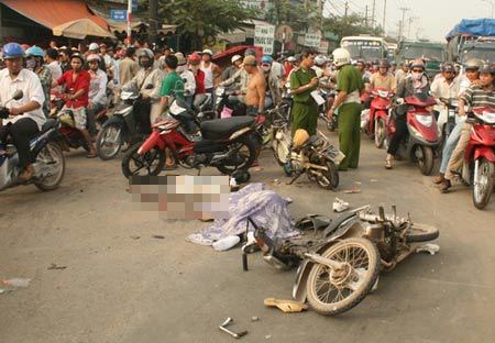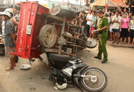 nhận một cảnh tượng hết sức kinh hoàng. Một chiếc ba bánh gắn máy chổng chơ, đè