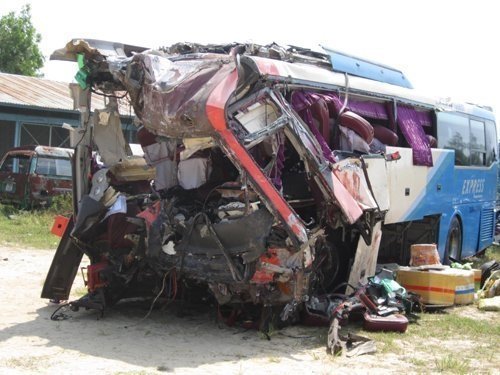 Chiếc xe khách bẹp dúm sau vụ tai nan kinh hoàng. 12 nạn nhân đã tử vong trong vụ tai nạn này |
