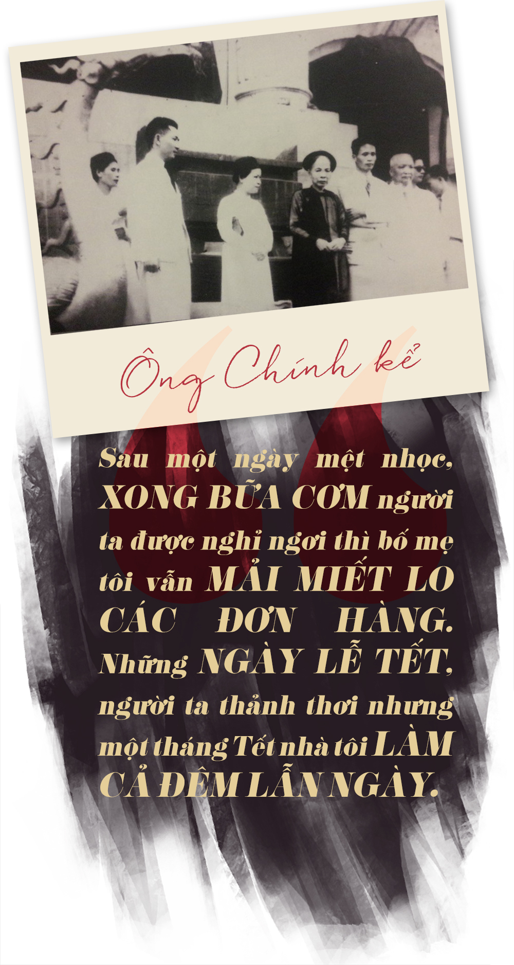 Ông Chính kể: "Bố mẹ tôi lao động rất vất vả. Sau một ngày mệt nhọc, xong bữa cơm người ta được nghỉ ngơi thì bố mẹ tôi vẫn mải miết lo các đơn hàng. Những ngày lễ Tết, người ta thảnh thơi nhưng một tháng Tết nhà tôi có tới 30 người làm cả đêm lẫn ngày.