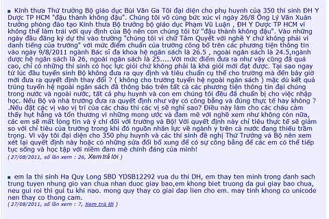 Một đại diện của phụ huynh viết thư gửi Thứ trưởng Bùi Văn Ga trên trang web của trường: "Tôi đại diện cho phụ huynh của 350 thí sinh ĐH Y Dược TP HCM "đậu thành không đậu". Tại sao ngay từ lúc đầu tuyển sinh, Bộ không đưa ra quy định và tiêu chuẩn cụ thể cho trường mà đến bây giờ mới đưa ra quyết định thay đổi không cho trường tuyển hệ ngoài ngân sách? Điều này làm cho các cháu cảm thấy hụt hẫng và tổn thương vì những mong ước và đam mê với nghề xem như không còn nữa, các em sẽ mất lòng tin và ý chí đối với trường và Bộ!