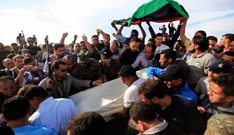 | Các sĩ quan cảnh sát mang thi thể của đại tá Faraj al-Dersi khỏi nhà xác ở Benghazi. (Ảnh: Reuters) |