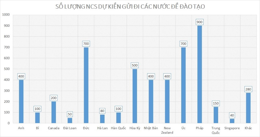 | 5.000 NCS sẽ được cử sang nước ngoài làm tiến sĩ theo nội dung đề án mới. Đây là phần chiếm nhiều kinh phí nhất. Các NCS sẽ được cử đi học tại 14 quốc gia chủ yếu kà những nước có chất lượng giáo dục hàng đầu như Anh, Canada, Hoa Kỳ, Đức, Pháp, Hà Lan, Nhật Bản, Hàn Quốc, Singapore…Trong số này, dự kiến nhiều nhất là Pháp 900 NCS, Australia, Đức 700 NCS, các quốc gia như Nhật Bản, New Zealand, Anh… 400 NCS. Đồ hoạ: Lê Văn |