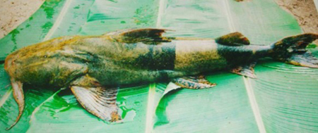 Con cá chiên khủng nặng 25kg, câu được ở vùng sông Đà. Nó là loại cá có hình thù cổ quái kì dị. Da cá có màu sắc loang đốm đen cùng màu xanh rêu, đầu cực to.