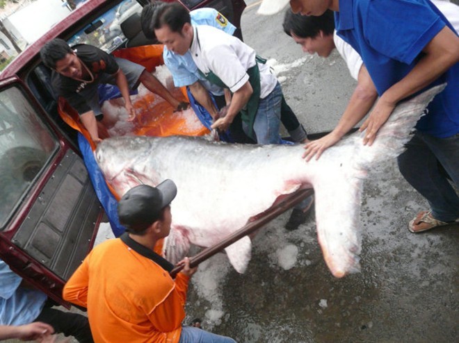 Con cá nặng 2 tạ, dài gần 2 m này do ngư dân Campuchia thả lưới bắt được trên sông Mê Kông.