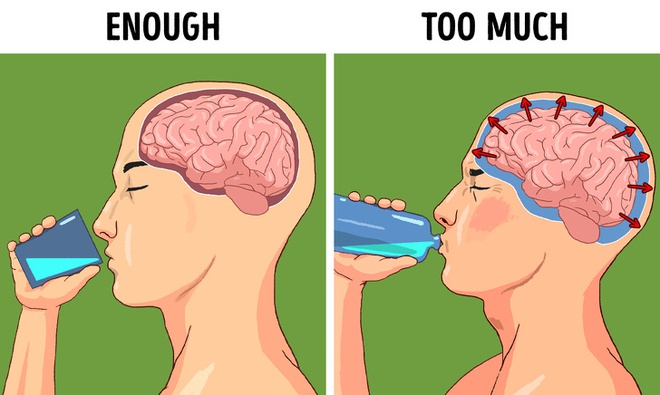 Uống nhiều nước là tốt. Nhưng quá nhiều nước có thể tạo ra sự mất cân bằng điện giải, do các ion natri và kali tự do bị thất thoát do việc tiết mồ hôi và đi vệ sinh. Một hậu quả khác cực đoan hơn là sự tích tụ nước trong não khiến nó sưng lên và tăng áp lực lên hộp sọ. Mặc dù rất hiếm nhưng cả hai trường hợp này đã được nhìn thấy ở các vận động viên, những người thường xuyên cảm thấy họ cần phải bù nước sau một buổi tập dài hoặc ở những người có vấn đề về thận.