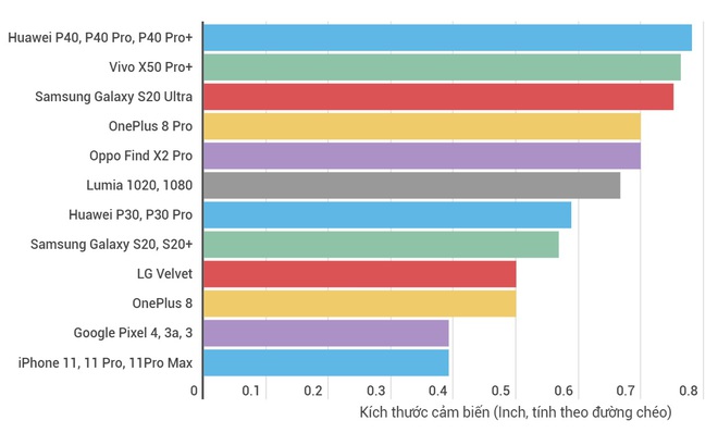 Hầu hết smartphone hiện nay đều có kích thước cảm biến rơi vào khoảng 1/2.55 inch, tức là khoảng 1cm đường chéo. Mặc dù một số smartphone mới có cảm biến lớn hơn, khoảng 1/1.7 inch hoặc lớn hơn nữa, thế nhưng con số này vẫn không nhằm nhò gì so với cảm biến của một chiếc máy ảnh DSLR, thường có kích thước lớn hơn 1 inch, tức là gấp khoảng 4 tới 5 lần so với cảm biến "tí hon" trên smartphone, dù cho các nhà sản xuất vẫn đang cố gắng thu hẹp khoảng cách này lại bằng cách tăng kích thước cảm biến camera trên smartphone. Điển hình là Huawei với chiếc P40/P40 Pro và P40 Pro+ với kích thước cảm biến lên tới 1/1.28 inch, lớn nhất trên thị trường smartphone hiện nay.