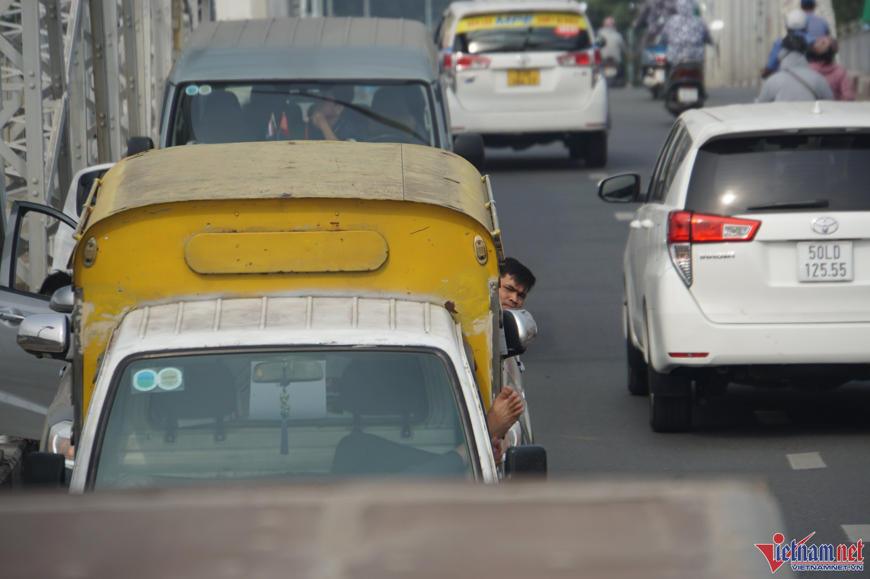 9h sáng 28/12, dòng ô tô nối dài qua cầu Tân Thuận hướng từ đường Nguyễn Tất Thành (quận 4) sang đường Huỳnh Tấn Phát (quận 7, TP.HCM) nơi có trạm đăng kiểm 50-06V đang hoạt động.