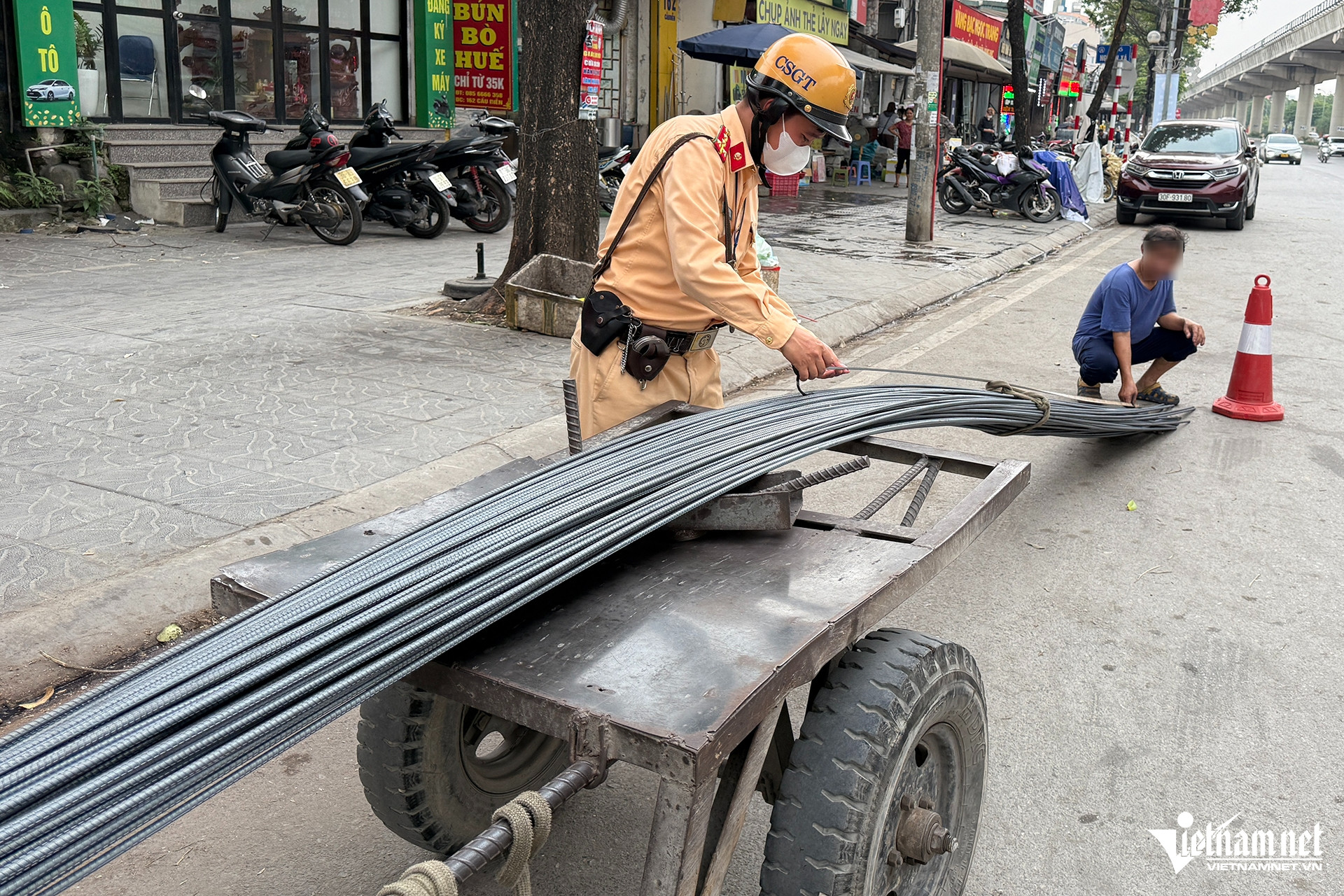 Ngày 9/5, Đội CSGT đường bộ số 6 (Phòng CSGT Công an Hà Nội) tăng cường tuần tra kiểm soát để xử lý các phương tiện tự chế kéo theo sắt, thép... gây mất an toàn giao thông.