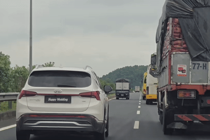 Trước đó, như VietNamNet đưa tin, ngày 16/8, một chiếc Hyundai Santa Fe chạy trên cao tốc Pháp Vân – Cầu Giẽ hướng từ Ninh Bình về Hà Nội bị người dân ghi lại cảnh sử dụng thiết bị che biển. Thay vì hiển thị biển số thật, phía sau xe gắn tấm biển in dòng chữ “Happy Wedding”.