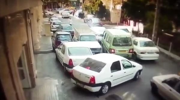 Bất chấp việc ngõ phố hẹp chỉ đủ chỗ cho 3 chiếc xe nhỏ dàn hàng ngang, tài xế lái chiếc xe tải màu trắng vẫn cố chen lên, không ngại đâm đụng, va quệt và làm trầy xước những ô tô khác.