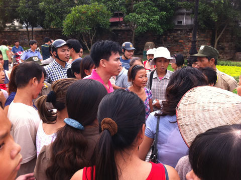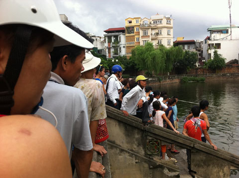 Nhiều người dân có mặt tại hồ Văn chứng kiến việc lặn vớt ba cháu bé. |