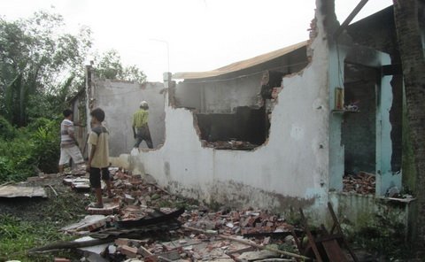Theo địa chỉ trên, chúng tôi đã tìm đến hiện trường. Căn nhà cấp 4 bị cháy có diện tích khoảng 40m2 chỉ còn lại một đống đổ nát. Mái tôn và nhiều mảng tường bị sập. Bên trong nhiều vật dụng bị cháy đen, bị lấp dưới đống gạch vụn.