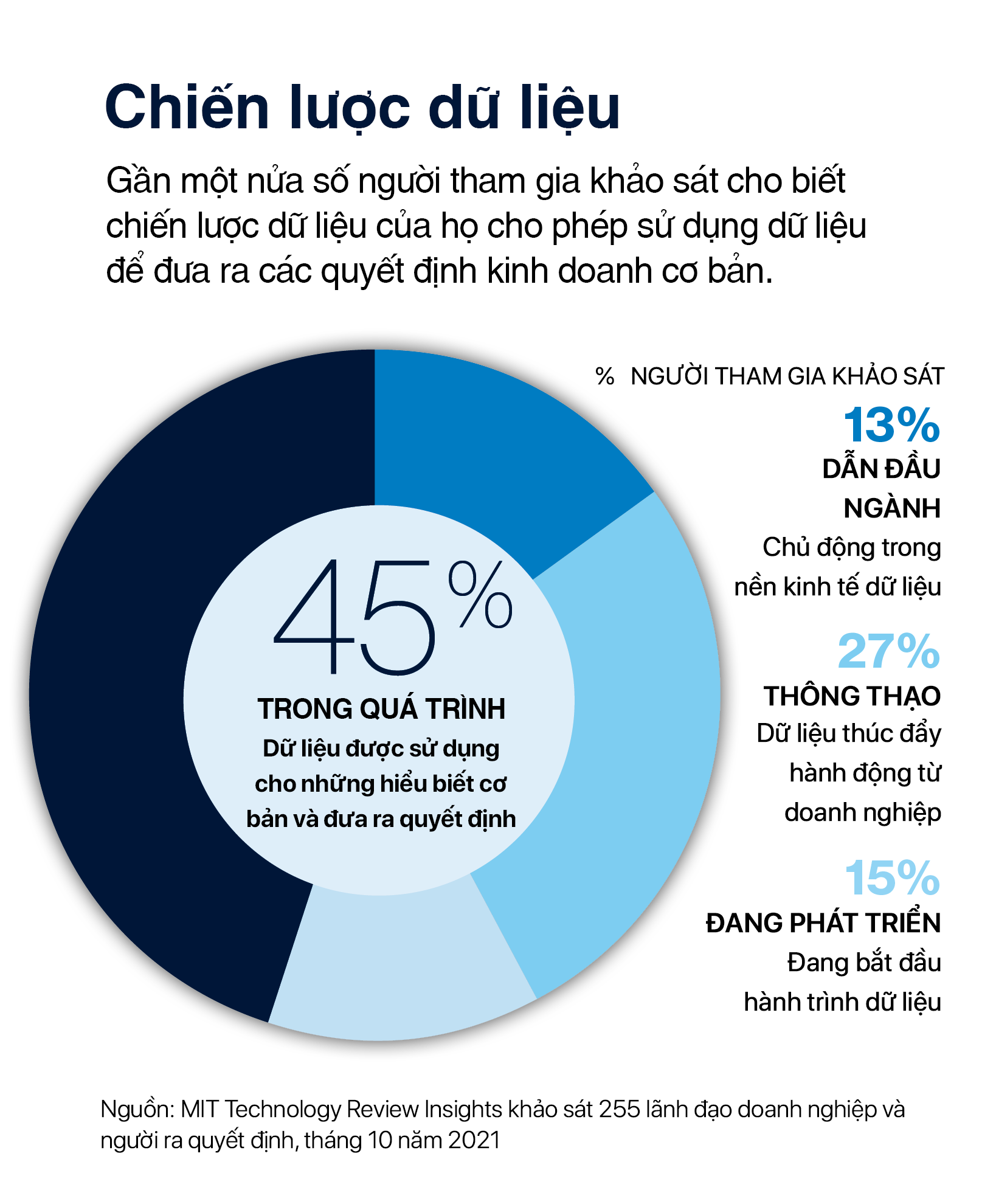 Tuy nhiên, theo khảo sát của MIT năm 2021, có đến 45% lãnh đạo doanh nghiệp được hỏi cho biết chỉ sử dụng dữ liệu để đạt được hiểu biết cơ bản và đưa ra quyết định.