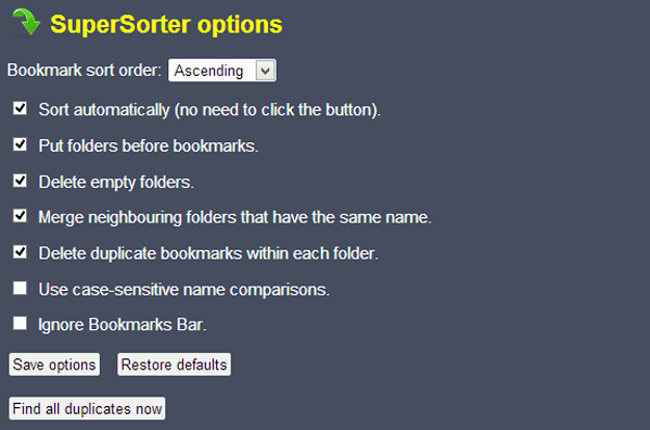 Nếu không để ý ngay từ đầu thì sau một thời gian sử dụng, thanh bookmark của bạn sẽ trở nên rất bừa bộn, làm mất đi lợi thế ban đầu của nó. Lúc này bạn hãy sử dụng một phần mở rộng của Chrome mang tên SuperSorter để sắp xếp các thư mục và các trang web một cách khoa học hơn, xóa đi những trang bị trùng, gộp các thư mục cùng tên hay xóa thư mục rỗng.
