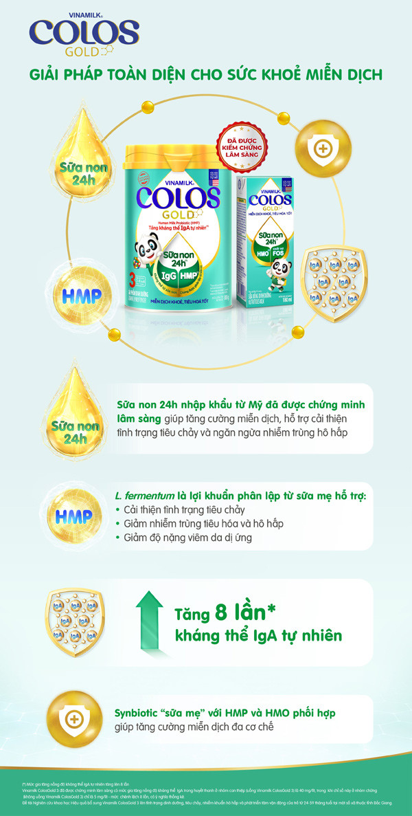 Hơn thế nữa, nhờ bổ sung sữa non 24h được nhập khẩu trực tiếp từ Mỹ và lợi khuẩn HMP phân lập từ sữa mẹ, Vinamilk ColosGold được chứng minh lâm sàng giúp giảm 70% nguy cơ nhiễm khuẩn hô hấp và giúp giảm 26% nguy cơ mắc táo bón. Tất cả các yếu tố này là tiền đề giúp trẻ có một hệ miễn dịch khỏe mạnh.