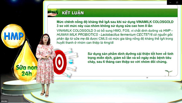 Đại diện Viện Dinh dưỡng quốc gia, TS.BS Trần Khánh Vân cung cấp những thông tin về chứng minh lâm sàng của ColosGold trên trẻ em Việt Nam giúp tăng cường miễn dịch. Theo đó, trẻ được bổ sung Vinamik ColosGold 3 giúp mức gia tăng nồng độ kháng thể IgA tự nhiên lên 8 lần, kháng thể này đóng vai trò tuyến phòng thủ giúp ngăn chặn sự xâm nhập của vi khuẩn, virus gây bệnh.