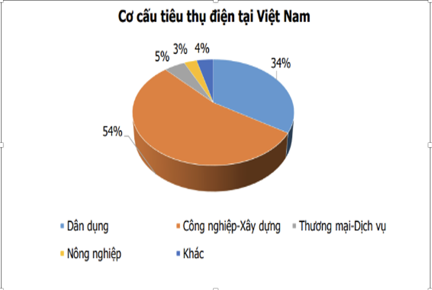 Theo báo cáo nội bộ của EVN (Bảng 1), cơ cấu tiêu thụ điện của Việt nam cho thấy khu vực công nghiệp và xây dựng chiếm 54% sản lượng điện tiêu thụ đạt 131.367 triệu kWh, trong đó điện tiêu dùng sinh hoạt chiếm 33% sản lượng đạt 80.744 triệu kWh.