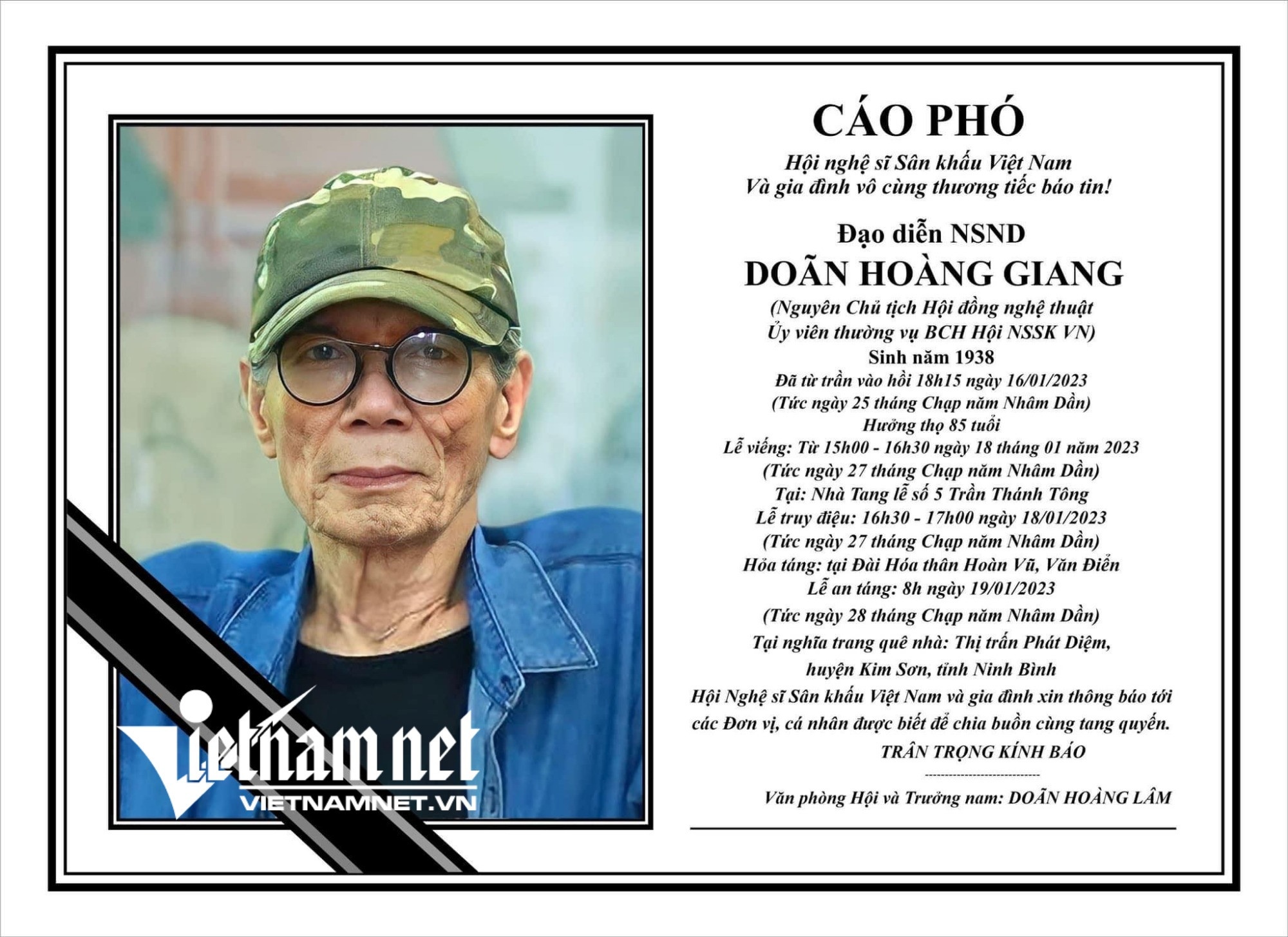 NSND Doãn Hoàng Giang là đạo diễn sân khấu gạo cội, thầy của rất nhiều nghệ sĩ sân khấu phía Bắc. Ông sinh năm 1938, qua đời lúc 18h15 ngày 16/1 tại nhà riêng, hưởng thọ 85 tuổi. Sự ra đi của ông khiến giới sân khấu bàng hoàng vì mất đi một cây đại thụ.