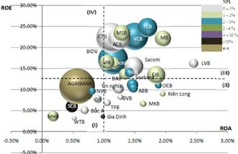 Trong khi đó, cũng theo dữ liệu cuối năm 2010, có thể định hình các nhóm khá rõ ràng trên cơ sở phân tích tổng hợp các tiêu chí cơ bản là tổng tài sản, tỷ số lợi nhuận trên tổng tài sản (ROA), tỷ số lợi nhuận trên vốn chủ sở hữu (ROE) và cả nợ phân loại.