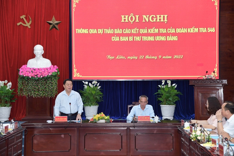 Phát biểu tại Hội nghị, đồng chí Nguyễn Trọng Nghĩa, Bí thư Trung ương Đảng, Trưởng Ban Tuyên giáo Trung ương nhấn mạnh: Thực hiện Quyết định số 546-QĐNS/TW của Ban Bí thư về việc thành lập Đoàn Kiểm tra công tác lãnh đạo, chỉ đạo và tổ chức thực hiện Nghị quyết Trung ương 4; Quy định số 08; Quy định số 37; Kết luận số 21, Kế hoạch số 03 đối với Ban Thường vụ Tỉnh ủy Bạc Liêu, Đoàn Kiểm tra số 546 đã ban hành Kế hoạch kiểm tra và phối hợp chặt chẽ với Ban Thường vụ Tỉnh ủy Bạc Liêu thực hiện kế hoạch kiểm tra. Ban Thường vụ Tỉnh ủy Bạc Liêu đã chuẩn bị công phu, nghiêm túc Báo cáo tự kiểm tra; Đoàn kiểm tra đã tiến hành kiểm tra, xác minh tại 5 tổ chức đảng trực thuộc và thu thập tài liệu, xây dựng dự thảo Báo cáo kết quả kiểm tra.