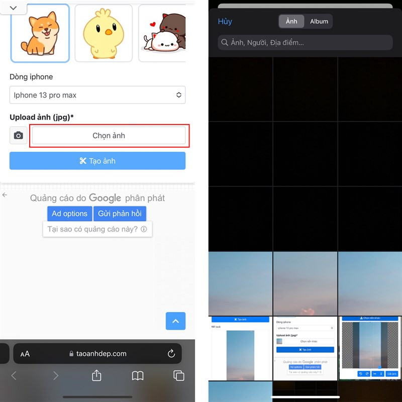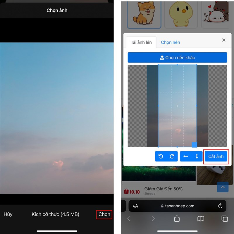 Trên iPhone, người dùng truy cập vào trang web "taoanhdep.com/tao-hinh-nen-nuoi-thu-cung-tren-tai-tho-iphone". Sau đó, hãy nhấn vào nút "Chọn ảnh" để tải lên hình nền mong muốn, rồi căn chỉnh ảnh cho phù hợp và nhấn vào nút "Cắt ảnh".