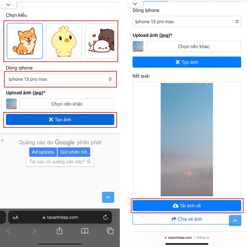 Bây giờ người dùng chọn mẫu thú cưng muốn lấy, chọn dòng iPhone đang cầm, và kích chọn vào "Tạo ảnh". Khi đã hoàn tất, hãy nhấn nút "Tải ảnh về" hoặc nhấn giữ vào ảnh để lưu ảnh về máy.