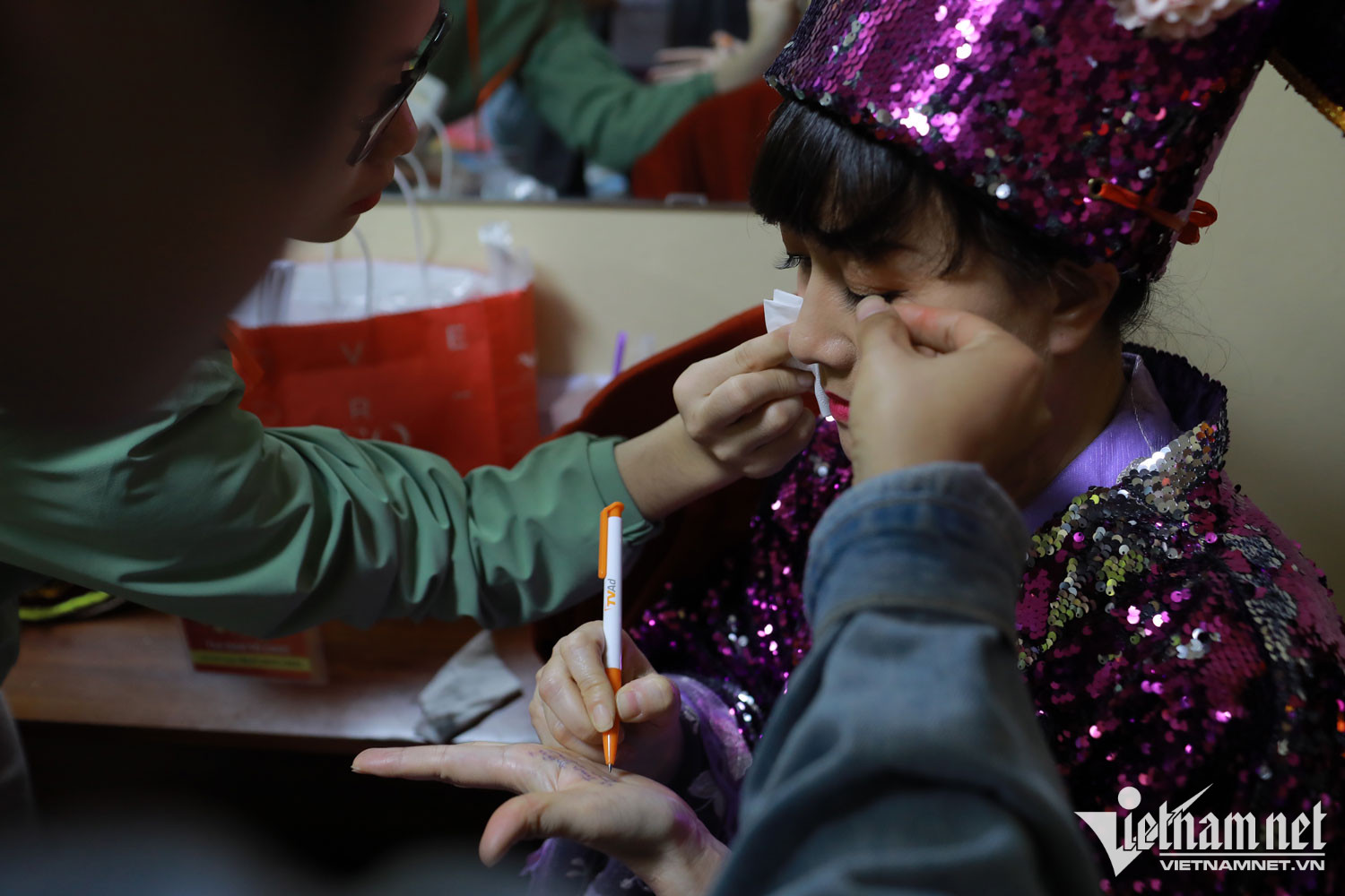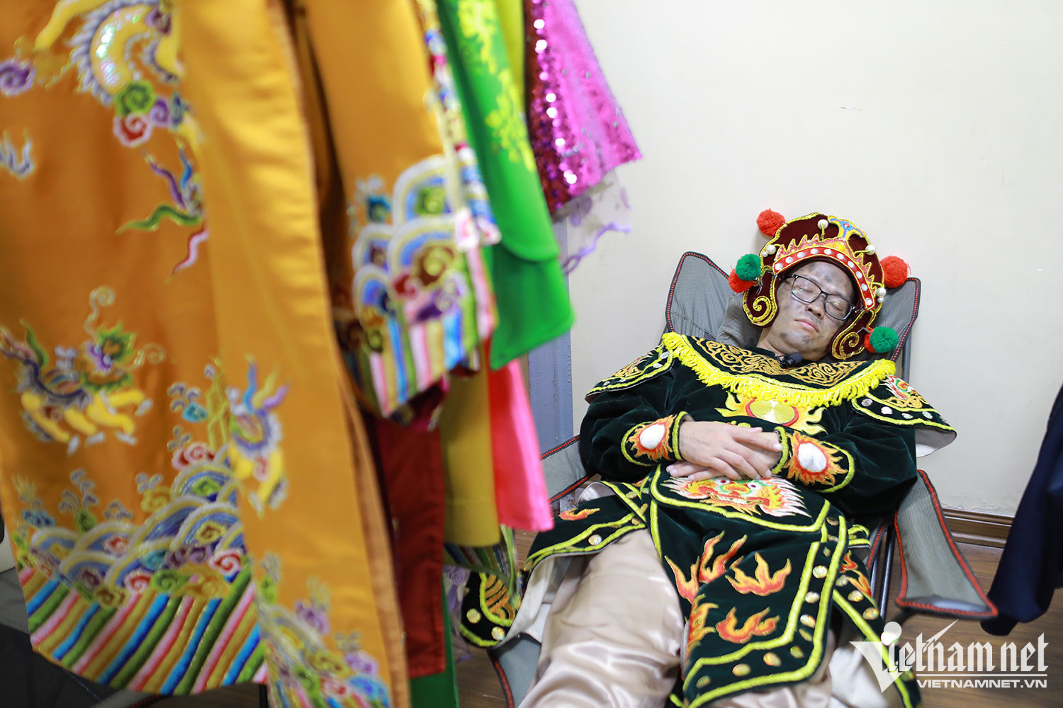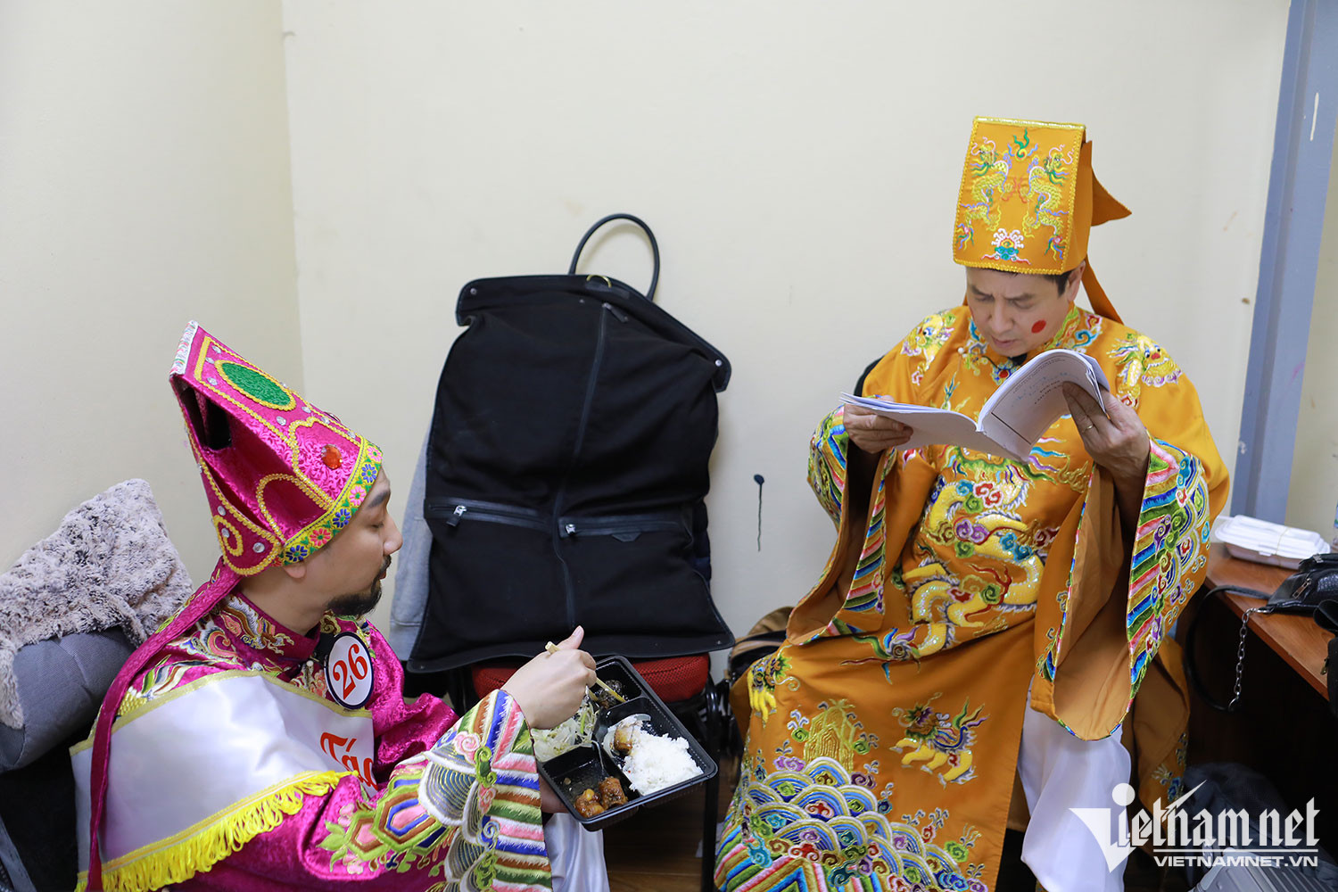 Trong lúc trang điểm chờ lên sân khấu, nghệ sĩ Vân Dung ghi vài lời thoại ra tay, Thành Trung tranh thủ 'lót dạ' bằng suất cơm hộp.