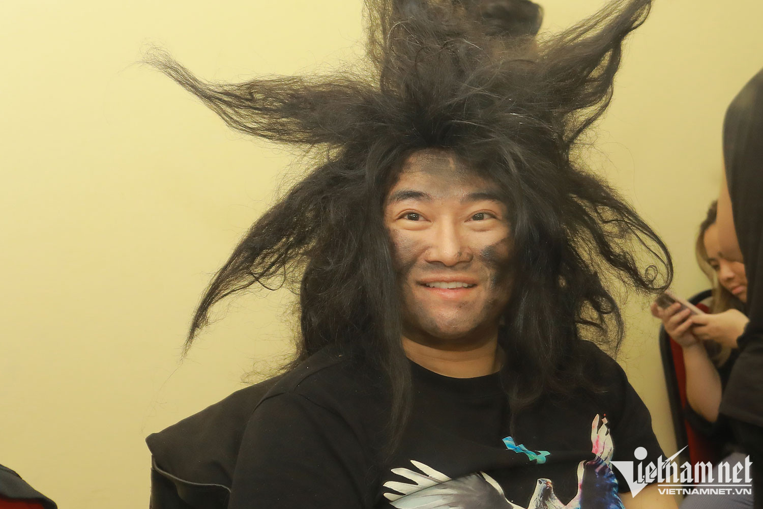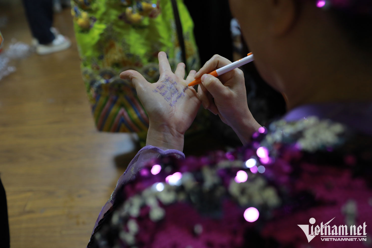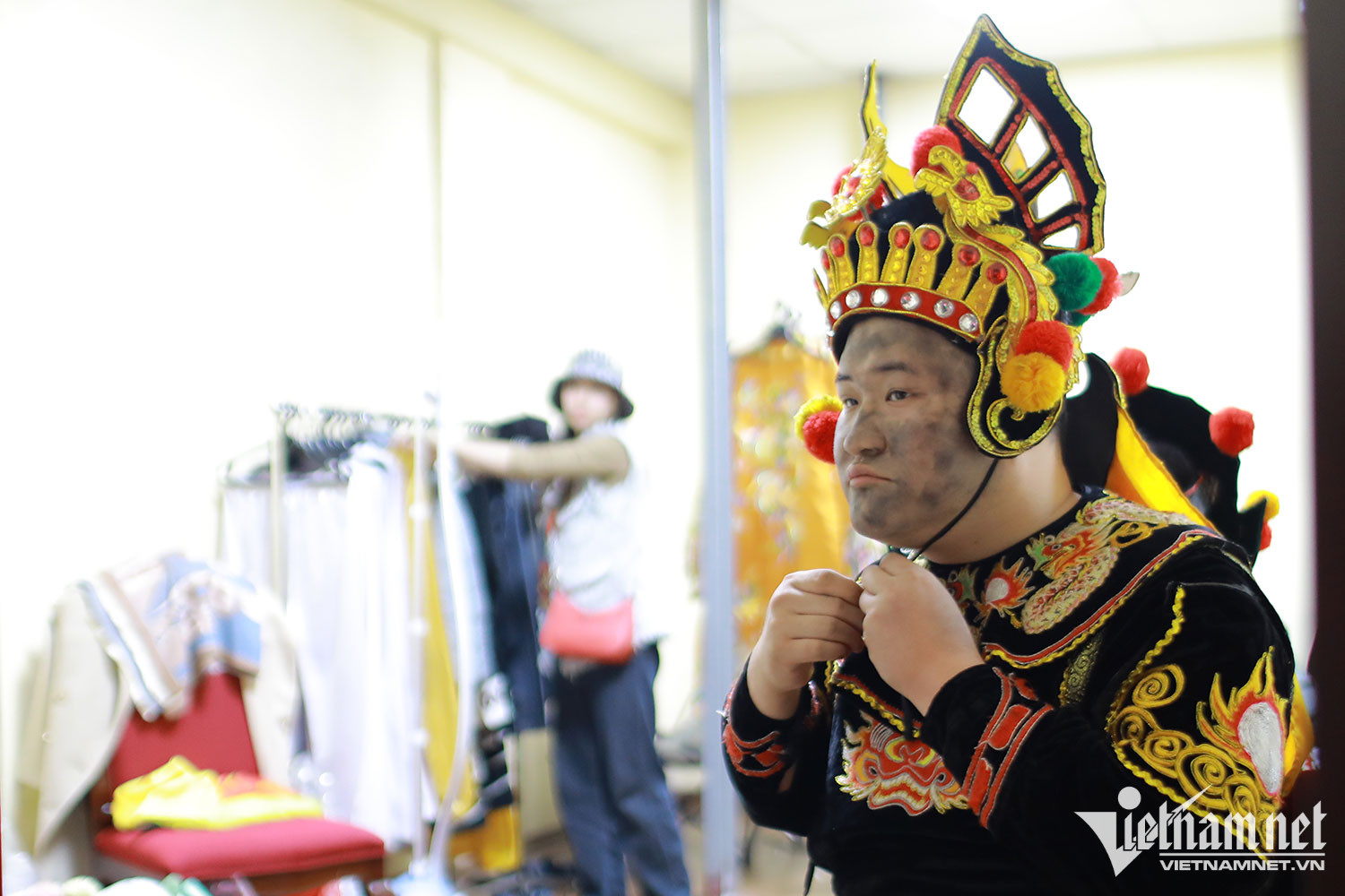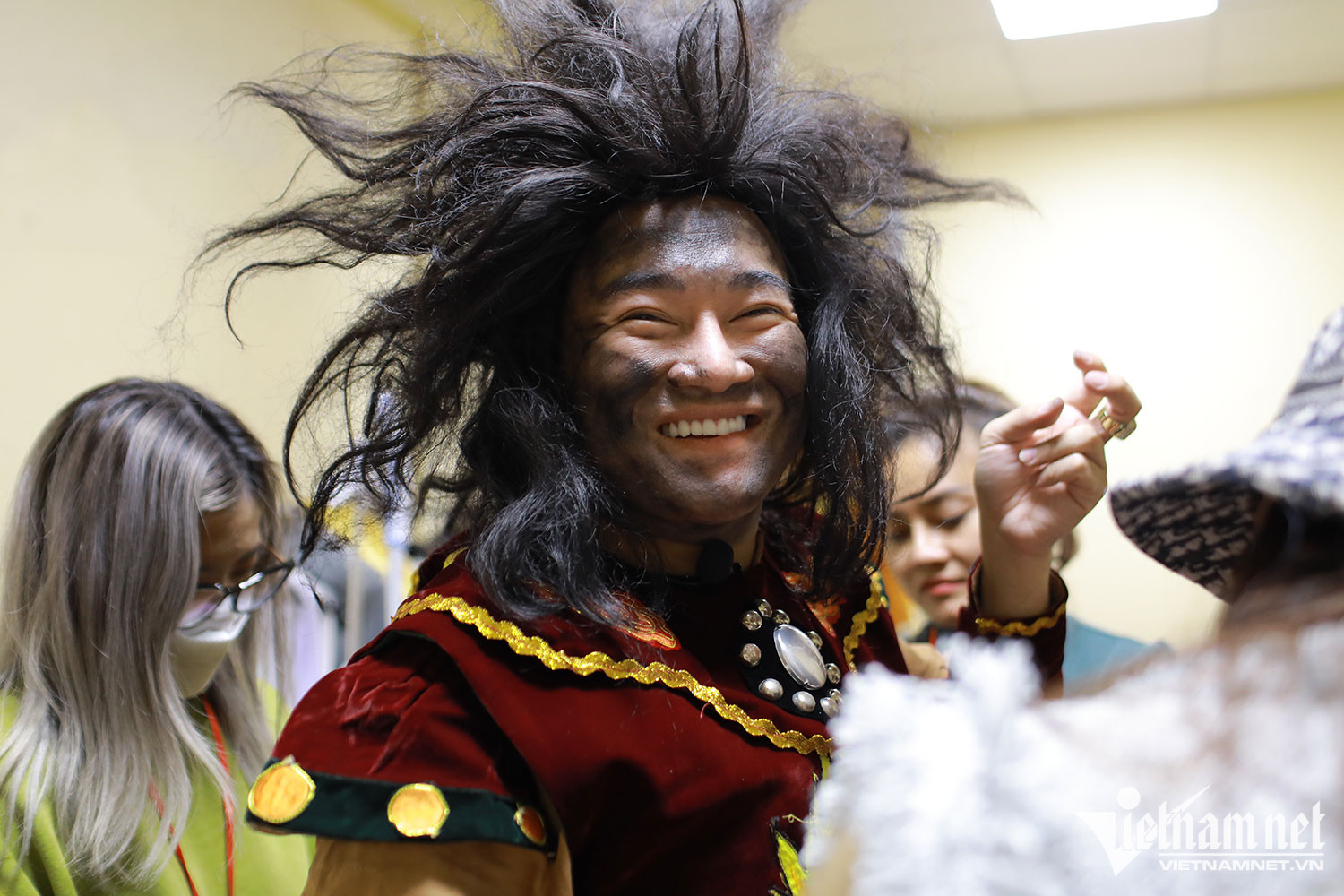 Trong lúc trang điểm chờ lên sân khấu, nghệ sĩ Vân Dung ghi vài lời thoại ra tay, Thành Trung tranh thủ 'lót dạ' bằng suất cơm hộp.