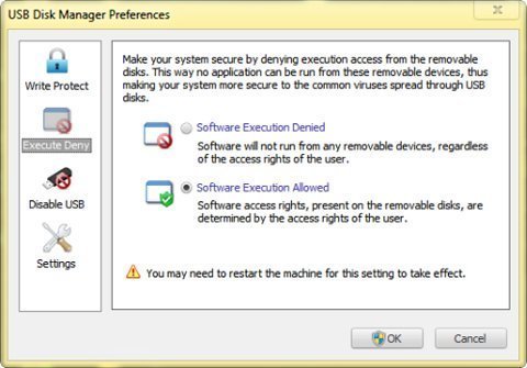 Thẻ Execute Deny gồm hai tùy chọn: Software Execution Denied (bật tính năng Software Execution) và Software Execution Allowed (tắt tính năng Software Execution). Khi bật Software Execution, bạn không thể thực thi một tập tin ứng dụng từ USB. Bạn cần khởi động lại máy để áp dụng tính năng này.