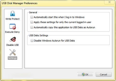 Thẻ Settings gồm các mục để thiết lập chương trình gồm: Automatically start this when I log in to Windows (tự khởi động chương trình cùng Windows), Automatically copy this application to USB Disks as Autorun (chép phần mềm USB Disk Manager vào ổ USB), Disable Windows Autorun for USB Disks (tắt Autorun của USB).