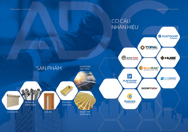 ADG sở hữu thương hiệu Cửa cuốn Austdoor - An toàn & thông minh hàng đầu Việt Nam và thương hiệu Nhôm Topal - Nhà sản xuất nhôm hàng đầu Việt Nam. Không ngừng mở rộng quy mô và lĩnh vực hoạt động, ADG còn gây ấn tượng mạnh tới người tiêu dùng với các thương hiệu Ngói thép và Kèo nhẹ Eratek, Giá đỡ pin mặt trời Sunrak, Phụ kiện kính Austdoor, cửa nhôm cao cấp Austwindow, Cửa gỗ Huge… tạo nên hệ thống sản phẩm cửa và vật liệu xây dựng hoàn hảo cho ngôi nhà.
