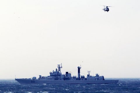 | Trực thăng cất cánh từ tàu khu trục Trung Quốc DDG-112 Harbin trong hoạt động diễn tập chống ngầm tại Hoàng Hải |